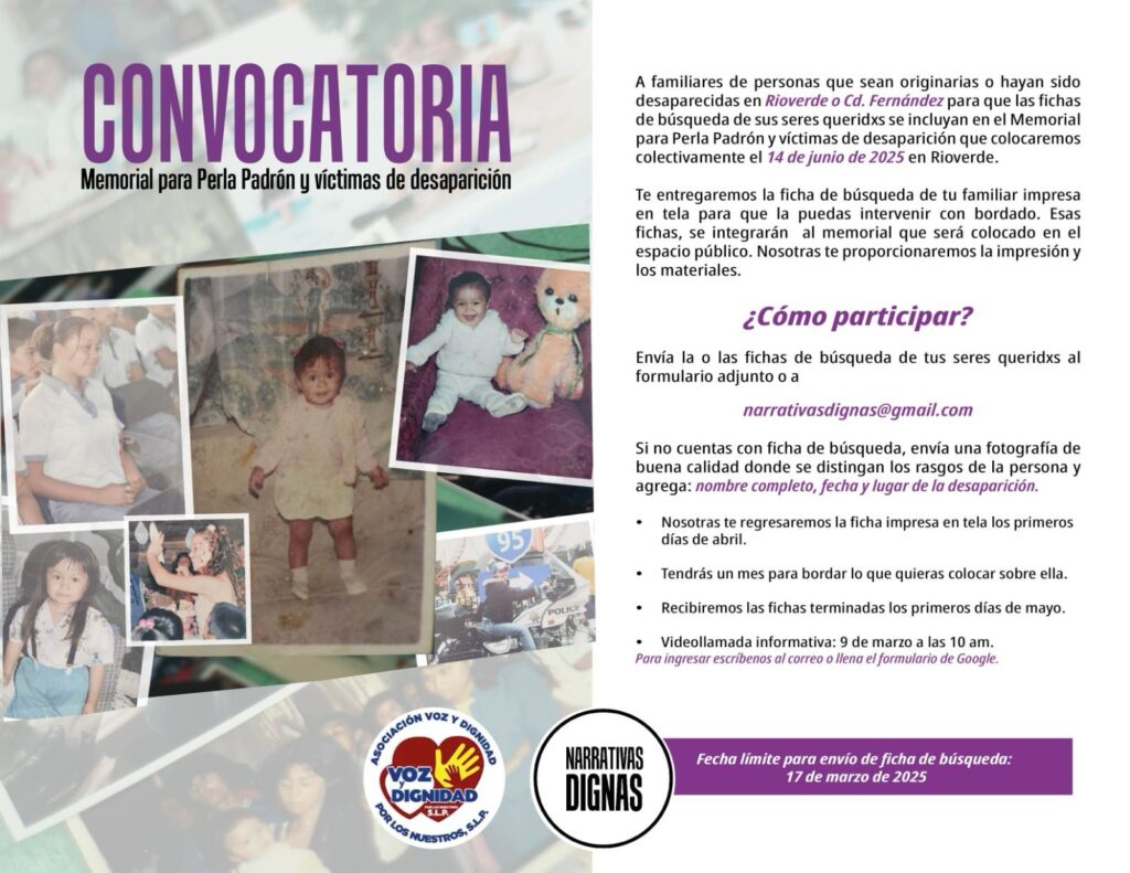 El proyecto Narrativas Dignas, en alianza con el colectivo Voz Y Dignidad Por Los Nuestros San Luis Potosí, invitan a familiares de personas desaparecidas en Rioverde y Ciudad Fernández a participar en el Memorial para Perla Padrón y víctimas de desaparición, que se instalará el próximo 14 de junio en la ciudad de Rioverde.