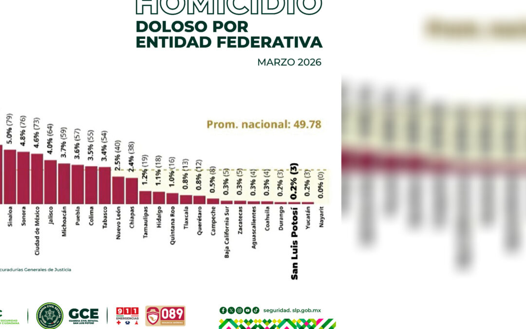 Datos del Secretariado Ejecutivo del Sistema Nacional de Seguridad Pública (SESNSP) indican que, en el acumulado del primer trimestre de 2026, San Luis Potosí se mantiene entre las entidades con menor incidencia en delitos de alto impacto, particularmente en homicidio doloso.