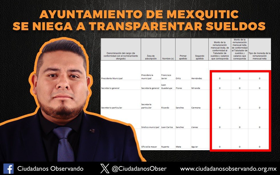 El Ayuntamiento de Mexquitic de Carmona, San Luis Potosí, encabezado por el alcalde Francisco Ortiz, mantiene una política abierta de opacidad y desacato a la ley, al negarse a transparentar los sueldos y percepciones de los integrantes del cabildo y de toda la plantilla laboral, una práctica heredada de la administración anterior de Hilario Leal y que ya suma cuatro años consecutivos.